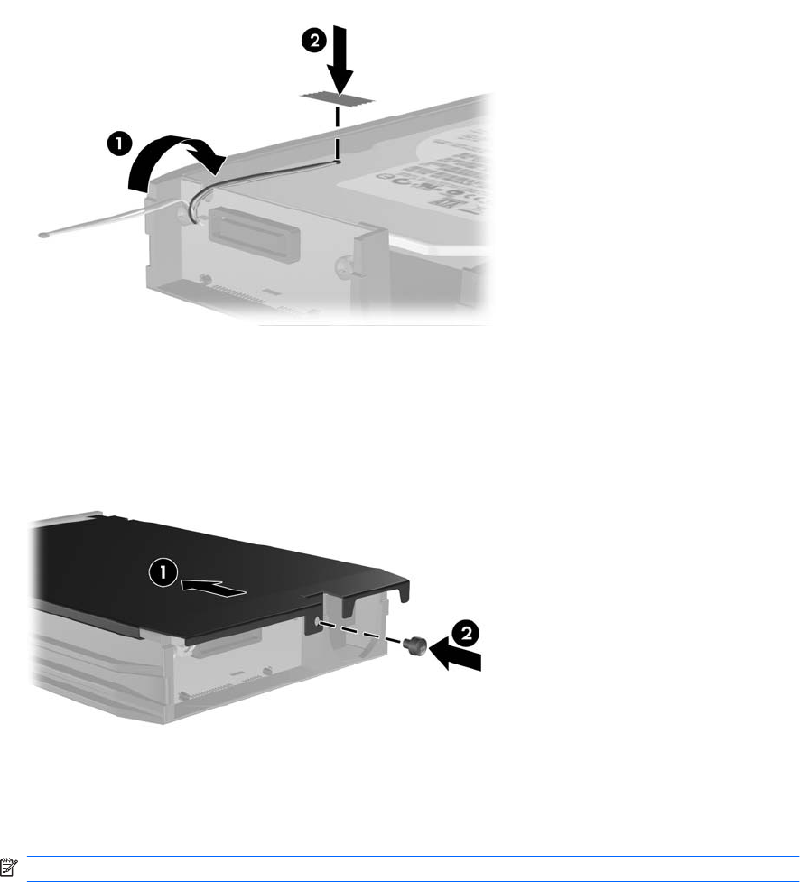 9. เลื่อนฝาปดบนโครงเหล็ก(1) และเปลี่ยนสกรูที่อยูดานหลังของโครงเหล็กเพื่อยึดฝาปดใหเขาที่(2)