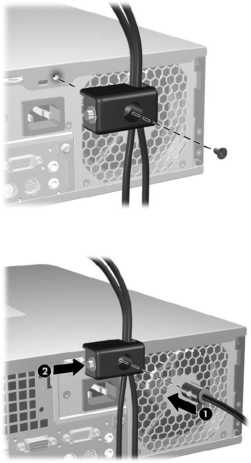 4. สอดปลายแทงเหลกลงในลอค (1)และดนปุม (2) เพื่อยดลอคเขาที่ ใชกญแจที่มีใหเพื่อคลายลอค