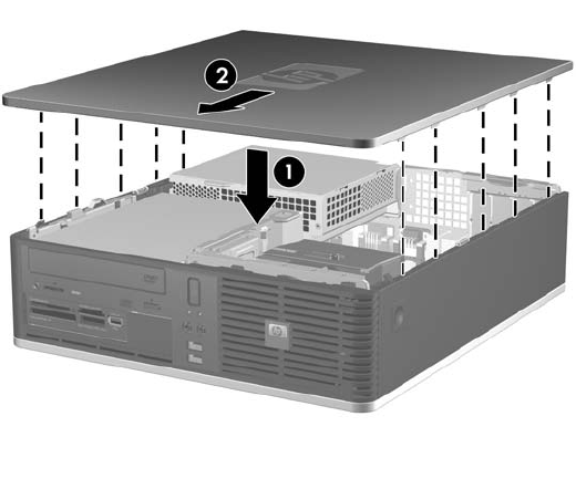 Ratakan tonjolan pada panel dengan slot pada rangka komputer (1), kemudian masukkan panel akses