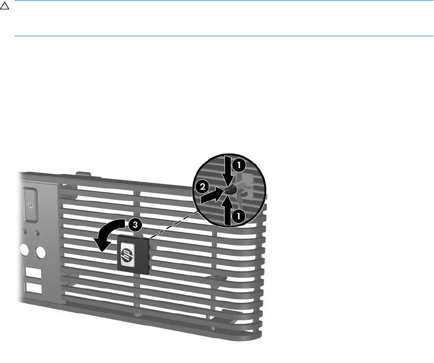 8. Putar pelat 90 derajat (3) lalu tarik tonjolan keluar untuk mengunci pelat logo pada tempatnya.