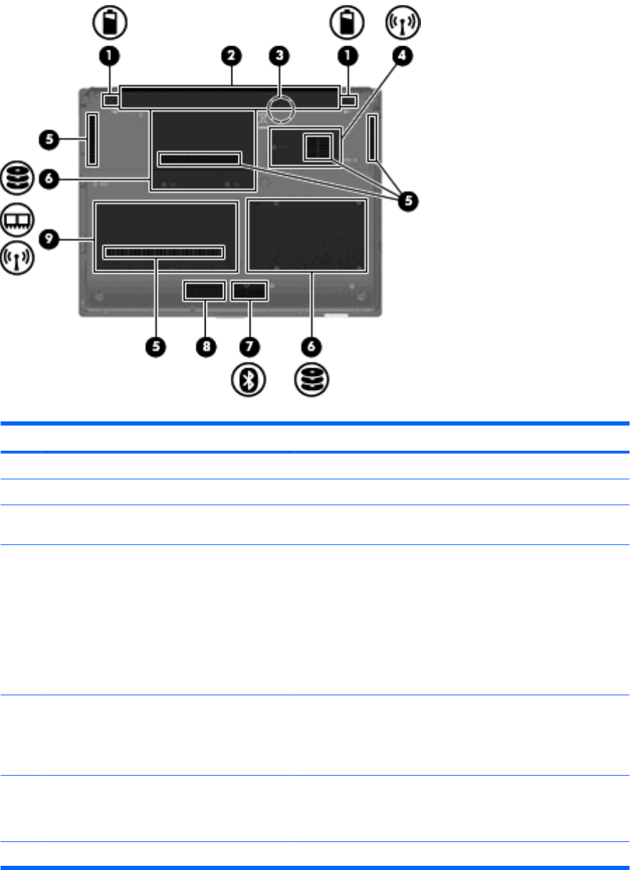 (4) Fack för trådlös bredbandsmodul Innehåller en HP-modul för mobilt bredband (endast vissa