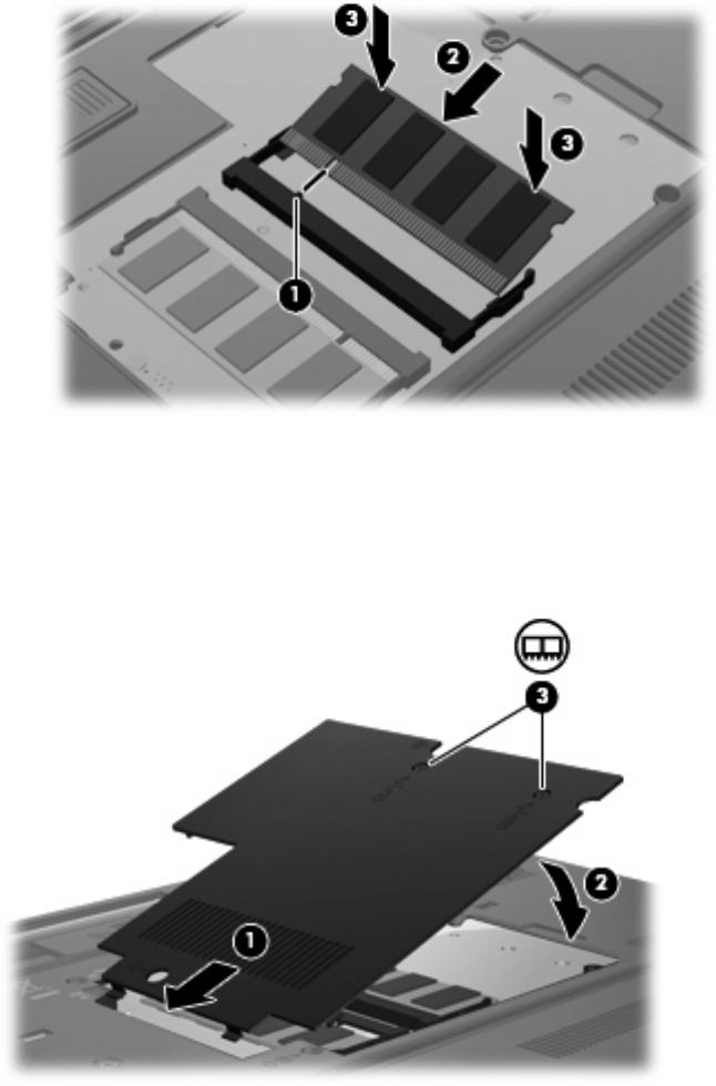 11. Alinhe as lingüetas (1) da tampa do compartimento do módulo de memória com as ranhuras do