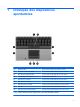 5 Utilização de teclados numéricos O computador possui um teclado numérico integrado e também suporta um teclado numérico externo opcional ou um teclado externo opcional que inclua um teclado numérico. NOTA: Seu computador pode ter aparência ligeiramente diferente da ilustração desta seção. Componente Descrição (1) Tecla fn Executa funções do sistema utilizadas com freqüência quando pressionada em combinação com a tecla de função ou com a tecla esc.