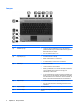 Komponenter på forsiden Komponent Beskrivelse (1) ● Turkis: En integrert trådløsenhet, som en WLAN-enhet (trådløst lokalnettverk), HP mobil bredbåndsmodul og/eller en Bluetooth-enhet, er slått på. ● Gul: Alle trådløse enheter er av. ● På: Datamaskinen er slått på. ● Blinker: Datamaskinen er i hvilemodus. ● Av: Datamaskinen er av eller i dvalemodus. ● Gul: Et batteri lades. ● Blinkende turkis: Et batteri er nesten fulladet.