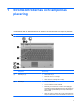 1 Strömkontrollernas och lampornas placering I nedanstående bild och tabell identifieras och beskrivs var strömkontroller och lampor är placerade. OBS! Din dator kan se lite annorlunda ut än den som visas på bilden i det här kapitlet. (1) (2) Komponent Beskrivning Strömlampor* (2) ● Tänd: Datorn är på. ● Blinkande: Datorn är i sömnläge. ● Släckt: Datorn är avstängd eller i viloläge. ● Gul: Ett batteri laddas. ● Turkos: Ett batteri är nästan fulladdat.