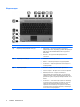 Компоненты (вид спереди) Компонент Описание (1) ● Бирюзовый — включено встроенное устройство беспроводной связи, например устройство беспроводной ЛВС, модуль HP Mobile Broadband и/или устройство Bluetooth. ● Желтый — все устройства беспроводной связи отключены. ● Светится — компьютер включен. ● Мигает — компьютер находится в ждущем режиме. ● Не светится — компьютер выключен или находится в спящем режиме. ● Желтый — аккумуляторная батарея заряжается.