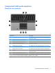 Componenti della parte superiore Dispositivi di puntamento Componente Descrizione (1) Stick di puntamento Consente di spostare il puntatore e di selezionare e attivare gli elementi sullo schermo. (2) Pulsante centrale dello stick di puntamento Ha la stessa funzione del pulsante centrale di un mouse esterno. (3) Pulsante destro dello stick di puntamento Ha la stessa funzione del pulsante destro di un mouse esterno. (4) Area di scorrimento del TouchPad Scorre in alto e in basso.