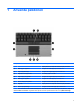 1 Använda pekdonen Komponent Beskrivning (1) Pekdon Flyttar pekaren och väljer eller aktiverar objekt på skärmen. (2) Mittknapp på styrspaken Fungerar som mittknappen på en extern mus. (3) Höger styrspaksknapp Fungerar som högerknappen på en extern mus. (4) Styrplattans rullningsområde För rullning uppåt och nedåt. (5) Höger knapp på styrplattan Fungerar som högerknappen på en extern mus. (6) Mittknapp på styrplattan Fungerar som mittknappen på en extern mus.