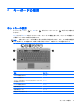 ポインティング デバイス機能のカスタマイズ [マウスのプロパティ]にアクセスするには、[スタート]→[コントロール パネル]→[ハードウェアとサ ウンド]→[マウス]の順に選択します。 ボタンの構成、クリック速度、ポインタ オプションのような、ポインティング デバイスの設定をカ スタマイズするには、Windows®の[マウスのプロパティ]を使用します。 タッチパッドの使用 タッチパッドのボタンは、外付けマウスの左右のボタンと同様に使用します。タッチパッドのスク ロール ゾーンを使用して画面を上下にスクロールするには、スクロール ゾーンの線上で指を上下に スライドさせます。 注記: ポインタの移動にタッチパッドを使用している場合、まずタッチパッドから指を離し、その 後でスクロール ゾーンに指を置きます。タッチパッドからスクロール ゾーンへ指を動かすだけで は、スクロール機能はアクティブになりません。 ポインティング スティックの使用 ポインタを移動するには、画面上でポインタを移動したい方向にポインティング スティックを押しま す。ポインティング スティックの左、中央、および右のボタンは、外付けマウスの各ボタ