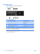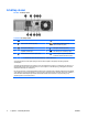 Billentyűzet 1-5 ábra A billentyűzet részei 1-4 táblázat A billentyűzet részei 1 HUWW 1 Funkcióbillentyűk A használt alkalmazástól függően speciális feladatokat hajtanak végre. 2 Szerkesztő billentyűk A következő billentyűkből áll: Insert (Beszúrás), Home (Elejére), Page Up (Lapozás vissza), Delete (Törlés), End (Végére) és Page Down (Lapozás előre). 3 Állapotjelző LED-ek A számítógép és a billentyűzet beállításainak állapotát jelzik (Num Lock, Caps Lock és Scroll Lock).