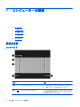 ボタン 説明 電源ボタン ● コンピューターの電源が切れているときにボタンを押す と、電源が入ります ● コンピューターの電源が入っているときにボタンを短く押 すと、スリープが開始されます ● コンピューターがスリープ状態のときにボタンを短く押す と、スリープが終了します ● コンピューターがハイバネーション状態のときにボタンを 短く押すと、ハイバネーションが終了します コンピューターが応答せず、Windows®のシャットダウン手順を 実行できないときは、電源ボタンを 5 秒程度押したままにする と、コンピューターの電源が切れます 電源設定について詳しくは、[スタート]→[コントロール パネ ル]→[システムとセキュリティ]→[電源オプション]の順に選択す るか、または『HP ノートブック コンピューター リファレンス ガイド』を参照します 6 第 2 章 コンピューターの概要
