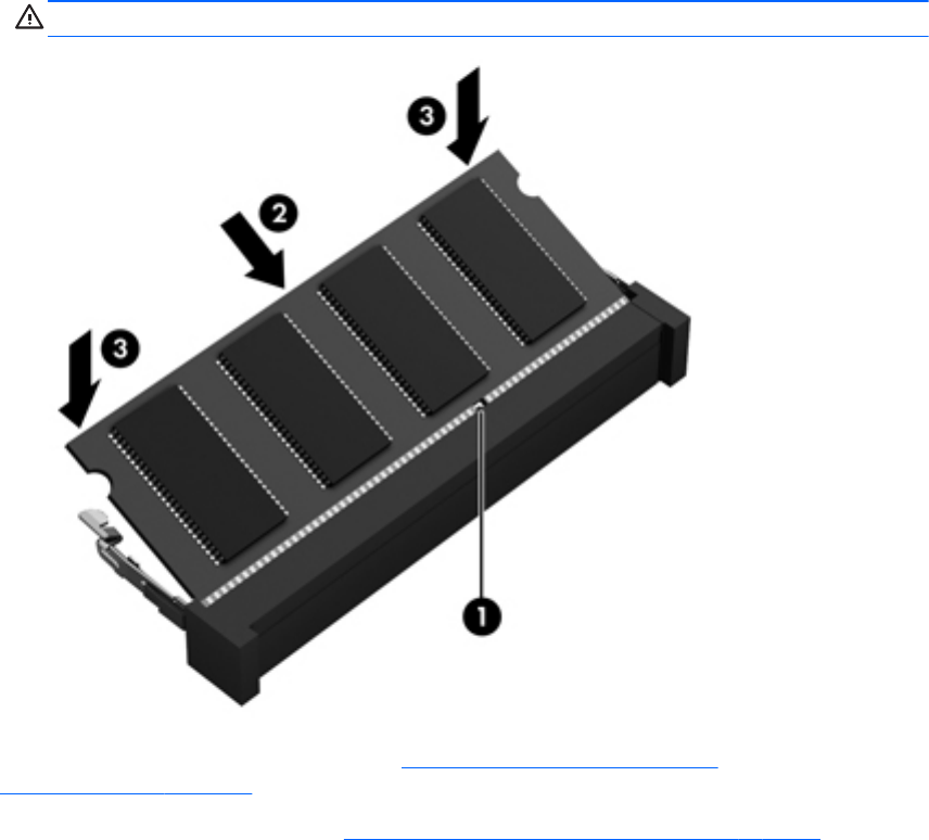 c. Óvatosan nyomja le a memóriamodult (3) a jobb és bal oldalán egyaránt, hogy a