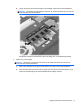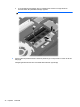 b. Ta tag i kanten på minnesmodulen (2) och dra försiktigt ut den från minnesmodulplatsen.