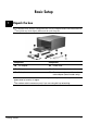 Basic Setup 1 Unpack the box color, features, and options may vary by computer model. The illustrations in ✎ Computer this guide may look slightly different from your computer. Component Component 1 AC adapter 4 Power cord* 2 Computer 5 Modem cable*† (select models only) 3 Battery* 6 Country- or region-specific modem cable adapter (select models only)* *Modem cables, batteries, modem cable adapters, and power cords vary in appearance by country or region.
