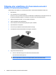 Tilføjelse eller udskiftning af hukommelsesmoduler Rummet til hukommelsesmodulet findes i bunden af computeren. Computerens hukommelseskapacitet kan opgraderes ved at tilføje et hukommelsesmodul i den tomme slot til hukommelsesmoduler eller ved at opgradere det eksisterende hukommelsesmodul i den primære hukommelsesmodulslot. ADVARSEL! Du kan mindske risikoen for elektrisk stød og beskadigelse af udstyret ved at koble netledningen fra og fjerne alle batterier, før du installerer et hukommelsesmodul.