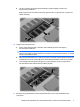 12. Luk dækslet (2). 13. Stram skruen på dækslet til hukommelsesmodulrummet (3). 14. Sæt batteriet i igen. 15. Løft computerens højre side, og tilslut derefter ekstern strøm samt eksterne enheder igen. 16. Tænd computeren. Opgradering af et hukommelsesmodul i den primære hukommelsesmodulslot Sådan opgraderer du et hukommelsesmodul i den primære hukommelsesmodulslot: 1. Gem dataene. 2. Luk computeren ned.