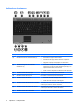 Componente Descripción (4) Enciende o apaga los recursos inalámbricos, pero no establece ninguna conexión inalámbrica. Botón de conexiones inalámbricas NOTA: Para establecer una conexión inalámbrica, debe configurar o acceder a una red inalámbrica. (5) Botón presentación Inicia el recurso de presentación. (6) Botón de silencio Suprime y restaura el sonido del altavoz. (7) Área de desplazamiento de volumen Ajusta el volumen del altavoz.