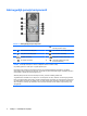 Priekšējās fasetes komponenti Diskdziņa konfigurācija var atšķirties atkarībā no modeļa. Tabula 1-1 Priekšējās fasetes komponenti 1 5,25 collu optiskie diskdziņi1 6 Optiskā diskdziņa izmešanas poga 2 Optiskā diskdziņa darbības indikatori 7 3,5 collu datu nesēju karšu lasītājs (papildu)2 3 Cietā diska darbības indikators 8 Divstāvokļu strāvas poga 4 Mikrofona/austiņu savienotājs 9 Ieslēgšanas indikators 5 Universālās seriālās kopnes (USB — Universal Serial Bus) 2.