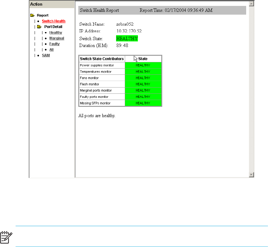 The Web Tools report view window contains choices to view the switch health, port detail, or