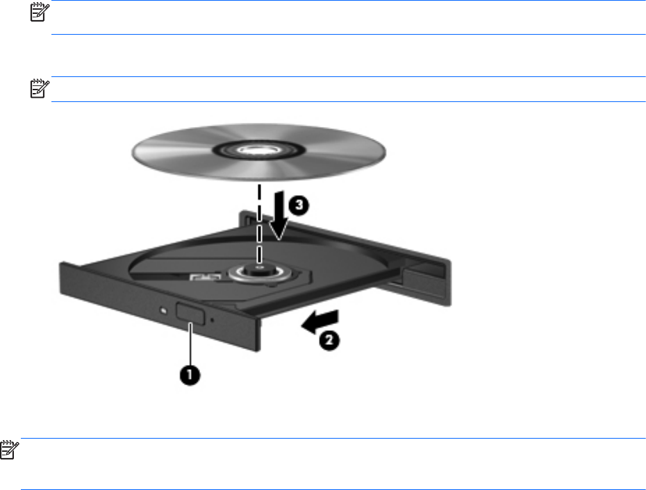 2. ドライブのフロント パネルにあるリリース ボタン(1)を押して、ディスク トレイが少し押し