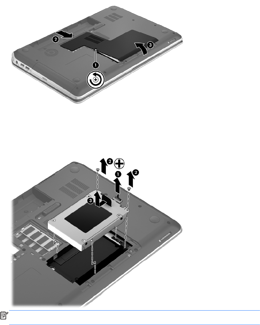 4. ハードドライブの 2 つのネジ(2)を取り外します。