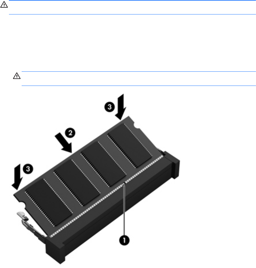 b. しっかりと所定の位置に収まるまでメモリ モジュールを 45°の角度でスロットに押し込み