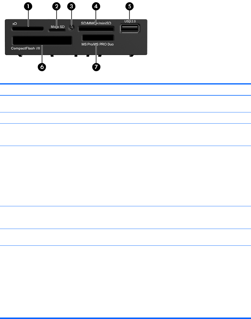 bralnika pomnilniških kartic glejte spodnjo sliko in preglednico.