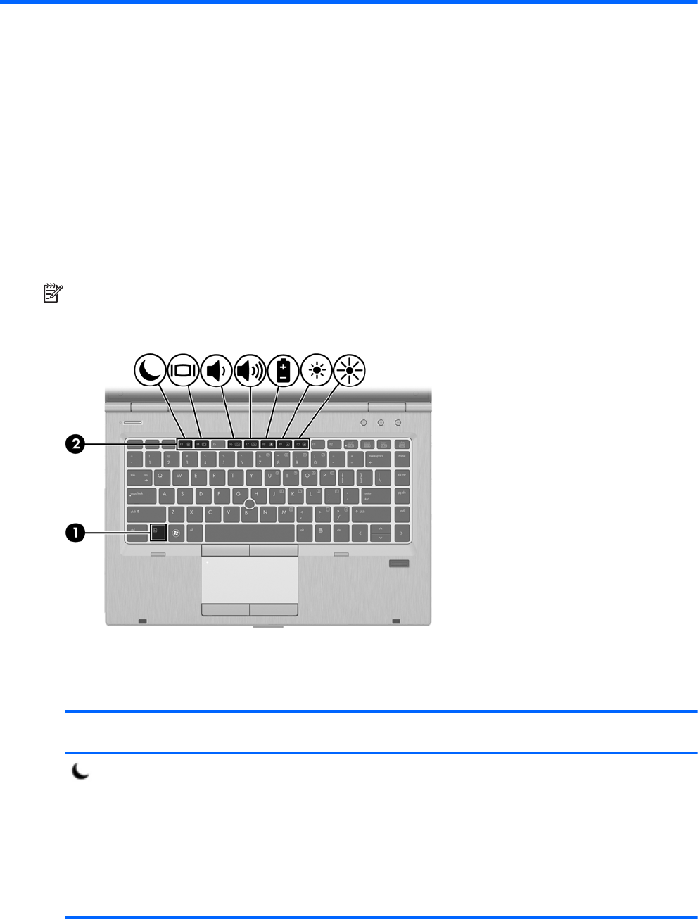 Klávesová zkratka je kombinace klávesy fn (1) a jedné z funkčních kláves (2).