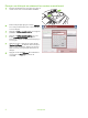 Remplacement des cartouches d'agrafes 1 Ouvrez la porte de l'agrafeuse. 2 Pour retirer la cassette d'agrafes, tirez la poignée verte, puis sortez la cassette. 3 Pour retirer la cartouche d'agrafes de la cassette, appuyez de part et d'autre de la cartouche (au niveau des flèches), puis tirez vers le haut pour la dégager. 4 Insérez la nouvelle cartouche d'agrafes dans la cassette. Appuyez sur la cartouche jusqu'à ce qu'elle s'enclenche. www.hp.