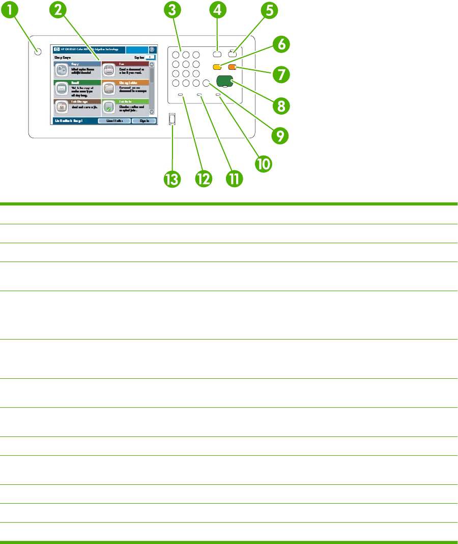 8 Start button Begin copying, scanning, printing a stored job, or resume printing a job that has