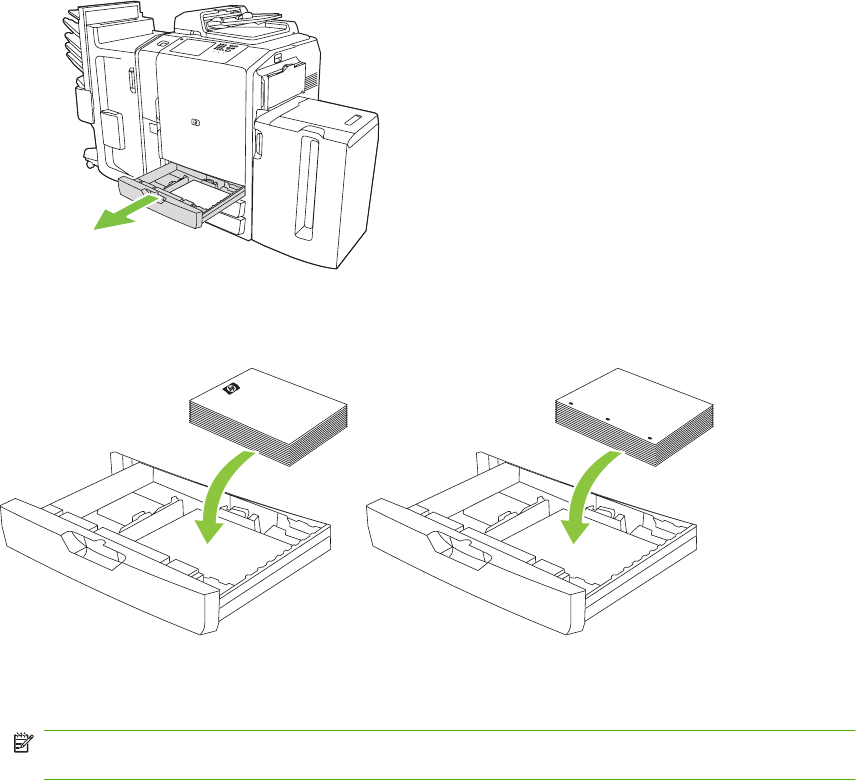2. Załaduj całą ryzę papieru na jeden raz. Długą krawędź umieszczaj zawsze wzdłuż przedniej strony