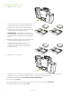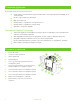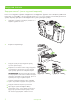 Замена картриджей сшивателя 1 Откройте дверцу сшивателя. 2 Чтобы извлечь кассету сшивателя, поднимите зеленую рукоятку, установленную в передней части кассеты, и выдвиньте ее. 3 Отожмите стрелки по краям картриджа со скрепками и извлеките его из кассеты. 4 Установите в кассету новый картридж со скрепками. Нажмите на картридж вниз до его полной фиксации. www.hp.