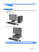 1 产品功能 标准配置功能部件 其功能因机型而异。要得到计算机所安装硬件和软件的完整列表,请运行诊断实用程序(仅某些计算机 机型附带该程序)。 图 1-1 小型立式机配置 图 1-2 薄型卧式纤小机配置 注: 薄型卧式纤小型计算机还可以使用立式机配置。有关详细信息,请参阅本指南中的“第 49 页的 从台式电脑配置更改为立式电脑配置”。 标准配置功能部件 1