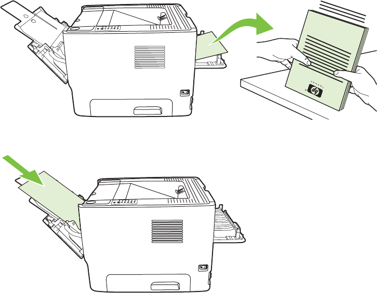8. Lägg tillbaka bunten i fack 1 med den den tryckta sidan nedåt och överkanten in mot skrivaren.