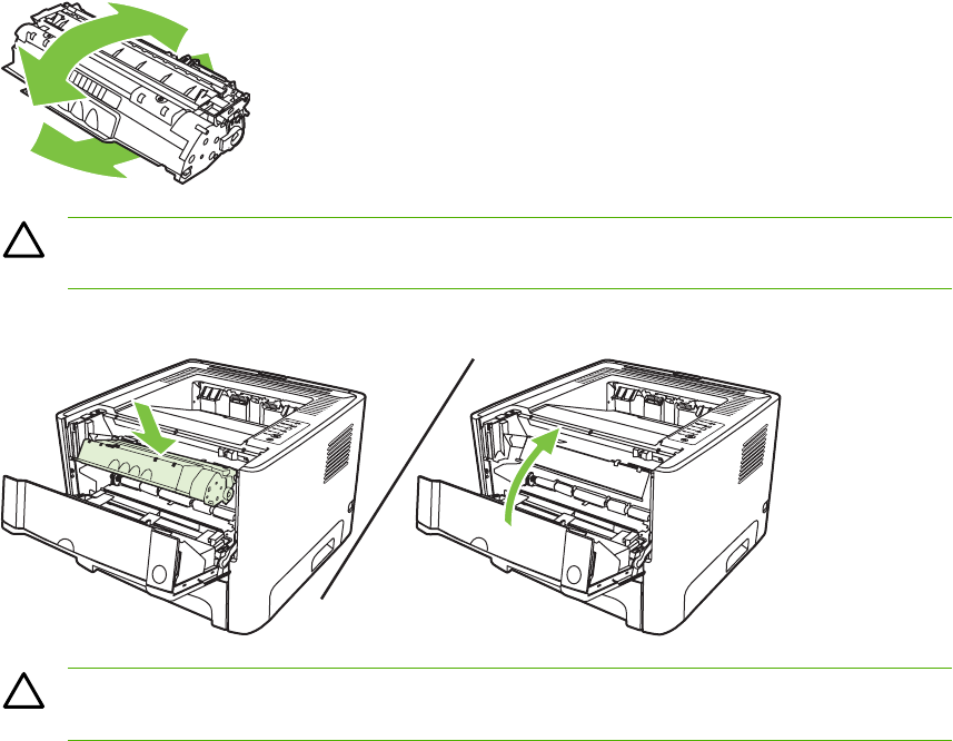 5. Skaka försiktigt på tonerkassetten fram och bakåt för att omfördela tonern jämnt inuti kassetten.