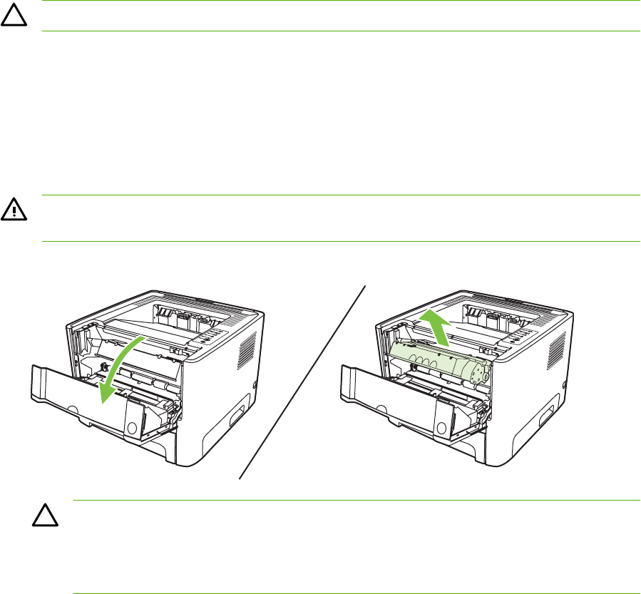 1. Tryck på knappen till tonerkassettluckan och ta ut tonerkassetten.