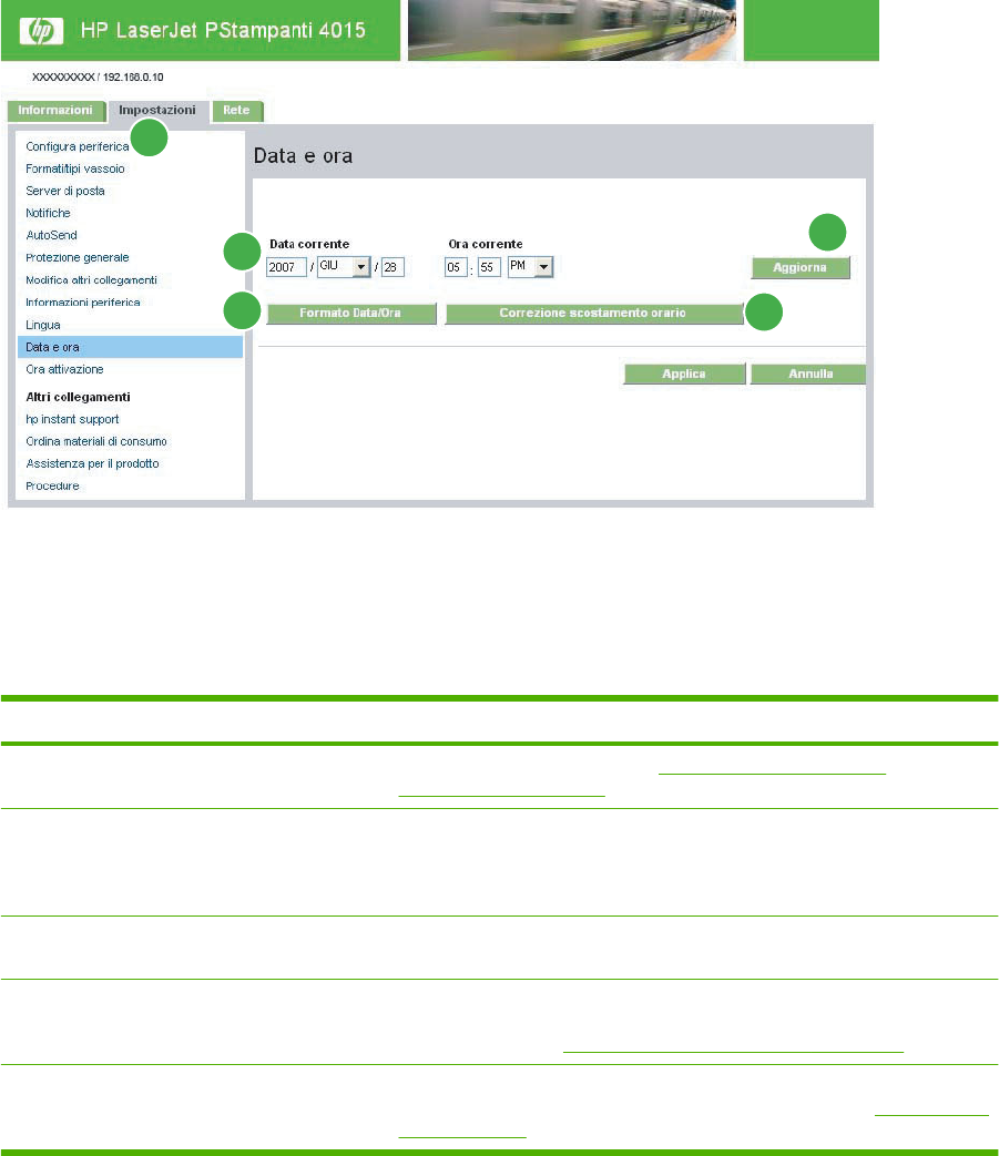 Utilizzare la schermata Data e ora per aggiornare l'ora del prodotto. L'illustrazione e la tabella seguenti