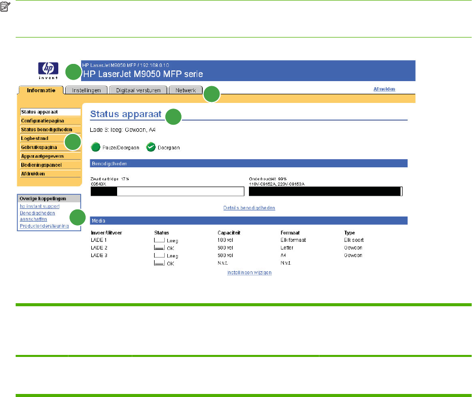 In de volgende afbeelding en tabel wordt informatie over de schermen van de HP EWS gegeven.