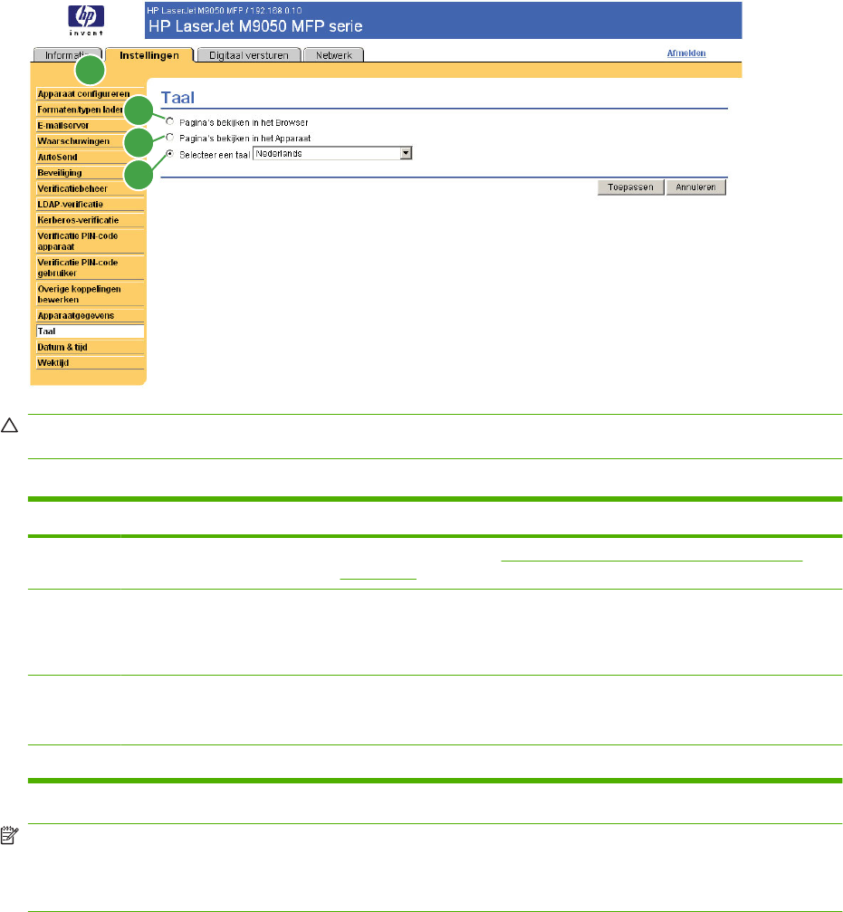geselecteerd. De schermen van de HP EWS verschijnen in dezelfde taal.