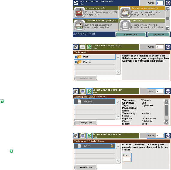 Volg de onderstaande procedure om een taak af te drukken die in het apparaatgeheugen is opgeslagen.