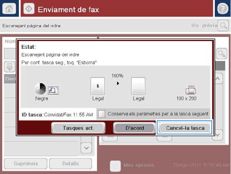 Per cancel·lar una tasca de fax actual, toqueu el botó Cancel·la tasca a la pantalla d'estat de fax.
