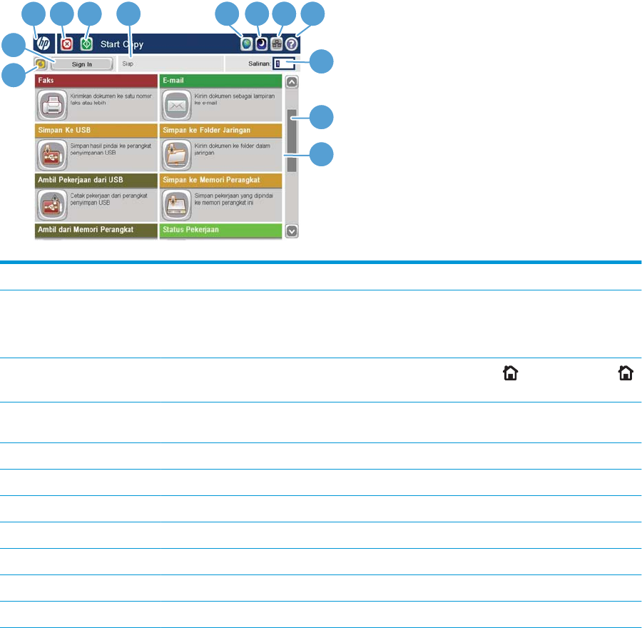 4 Tombol Berhenti Sentuh tombol Berhenti untuk menghentikan sementara pekerjaan yang sedang aktif. Layar Status