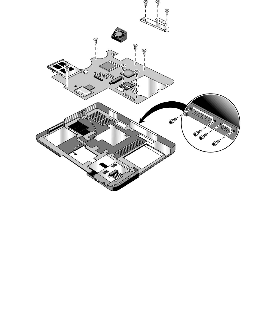 the other on the left edge of the motherboard) that secure the motherboard to the bottom case.