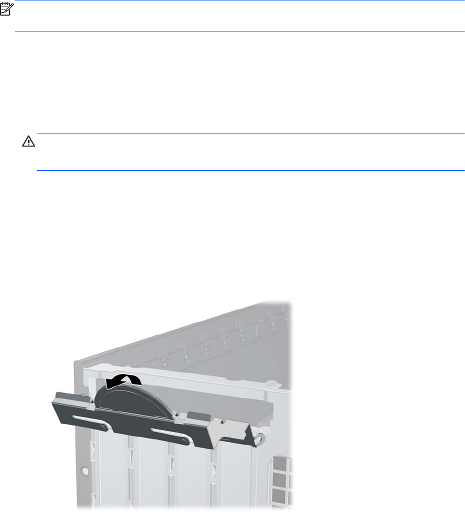 8. Release the slot cover retention latch that secures the PCI slot covers by lifting the green tab on