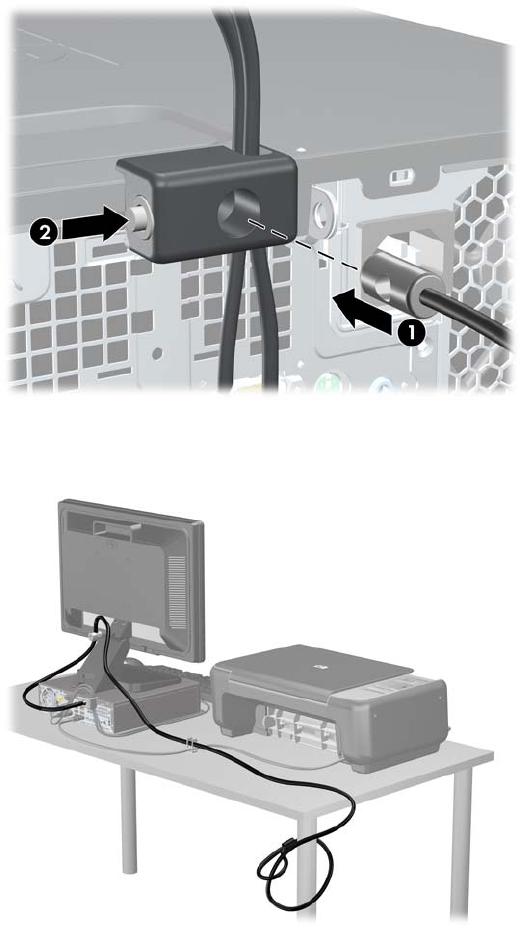 7. Insert the plug end of the security cable into the lock (1) and push the button in (2) to engage the