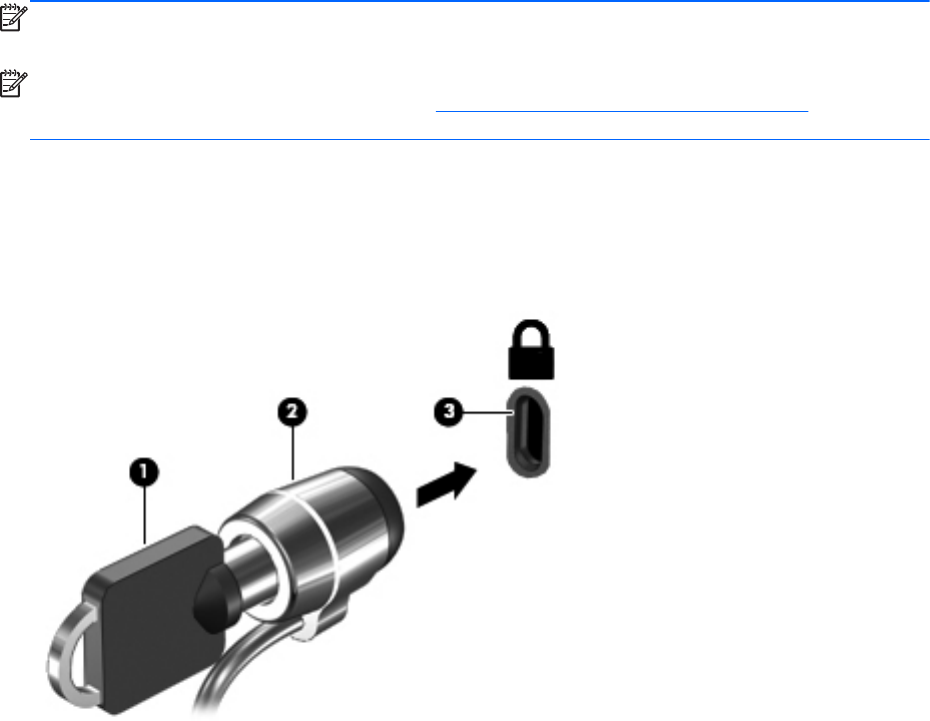 3. Introduza o cadeado do cabo no slot do cabo de segurança no computador (3) e, em seguida,