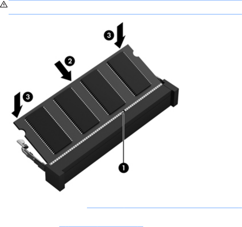 c. カチッと音がして留め具がメモリ モジュールを固定するまで、メモリ モジュールの左右の