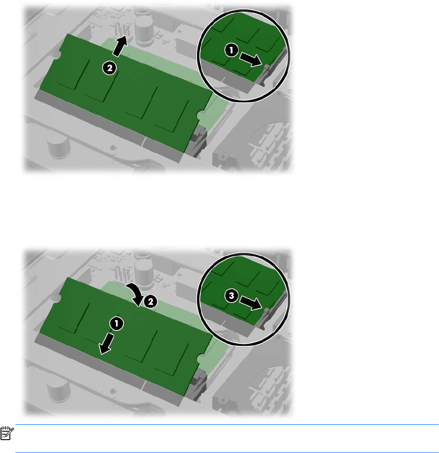 음(1) 소켓 바깥으로 SODIMM 을 당깁니다(2).