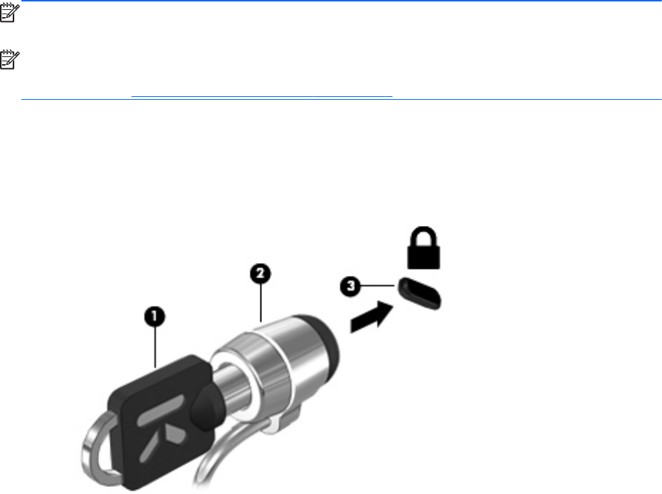 3. Vložte zámek kabelu do zásuvky pro bezpečnostní kabel na počítači (3) a klíčem zamkněte