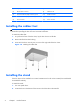 5. Press the SODIMM down into the compartment (2). 6. If you are installing the SODIMM in the HP t610 Thin Client, place a thermal pad on the SODIMM. CAUTION: The thermal pad is required to help cool the SODIMM in the HP t610 Thin Client. (The HP t610 PLUS Thin Client does not require a thermal pad.) Figure 2-10 Installing the thermal pad in the HP t610 Thin Client 7. Insert the tab on the front edge of the access plate into its slot (1) and press the plate down lightly to engage the latch (2).